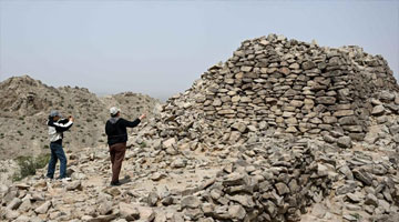 5月13日,驼峰(长城)文物保护队员许继龙(右)和乌仁其其格在巡查阿拉善左旗一处石圈遗址。