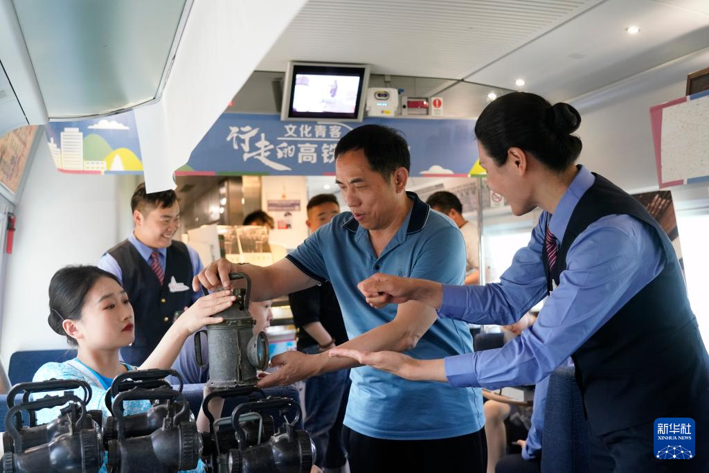 5月15日,列车乘务人员向观展旅客介绍早期铁路工作人员使用过的手提煤油信号灯。