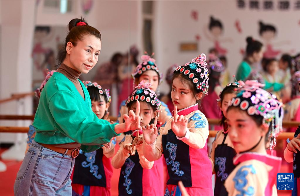 5月17日,乌兰浩特市山城路小学教师在“戏曲传承进校园 梨园雅韵润童心”主题活动中指导学生戏曲动作。