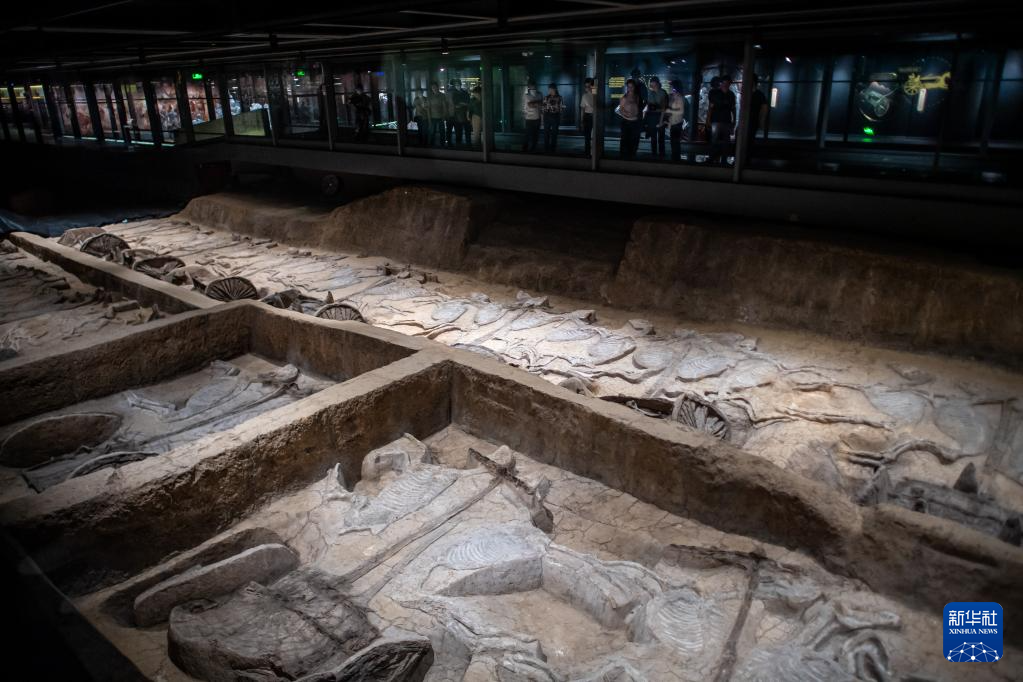 5月20日,在熊家冢国家考古遗址公园,游客在车马坑前参观。