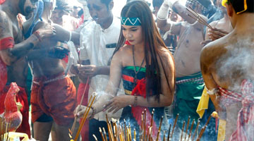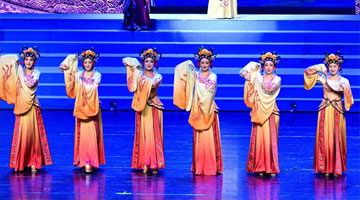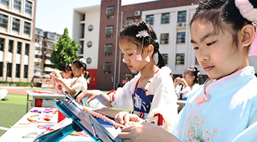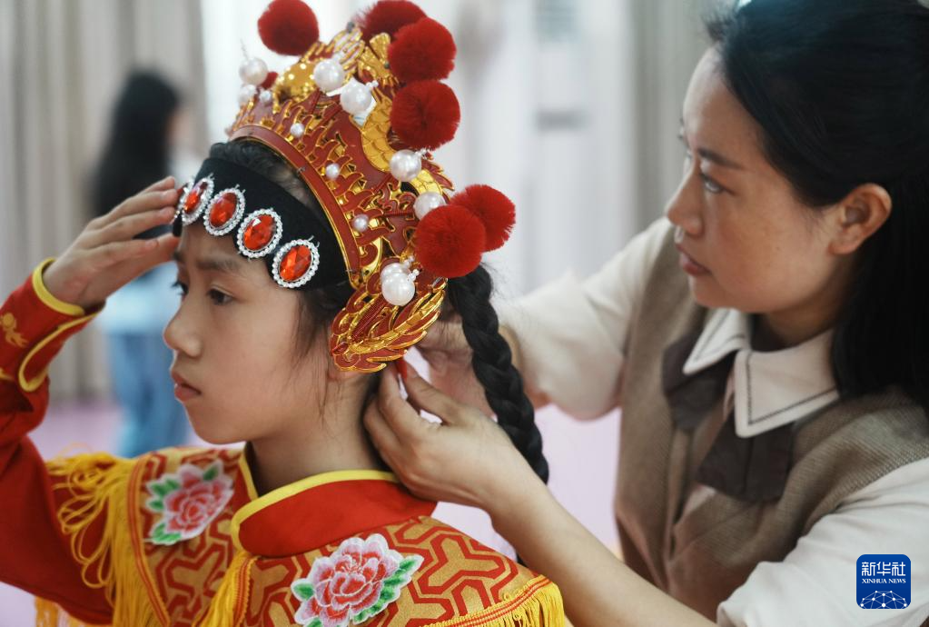 在江西省宜黄县水北新区小学,老师(右一)在给学生整理头饰(5月25日摄)。