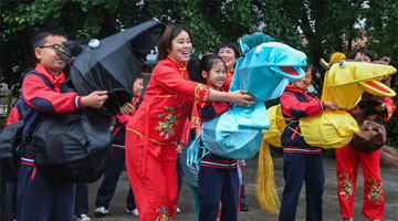 在江西省宜黄县水北新区小学,老师带领学生们排练六一儿童节的宜黄戏节目(5月25日摄)。
