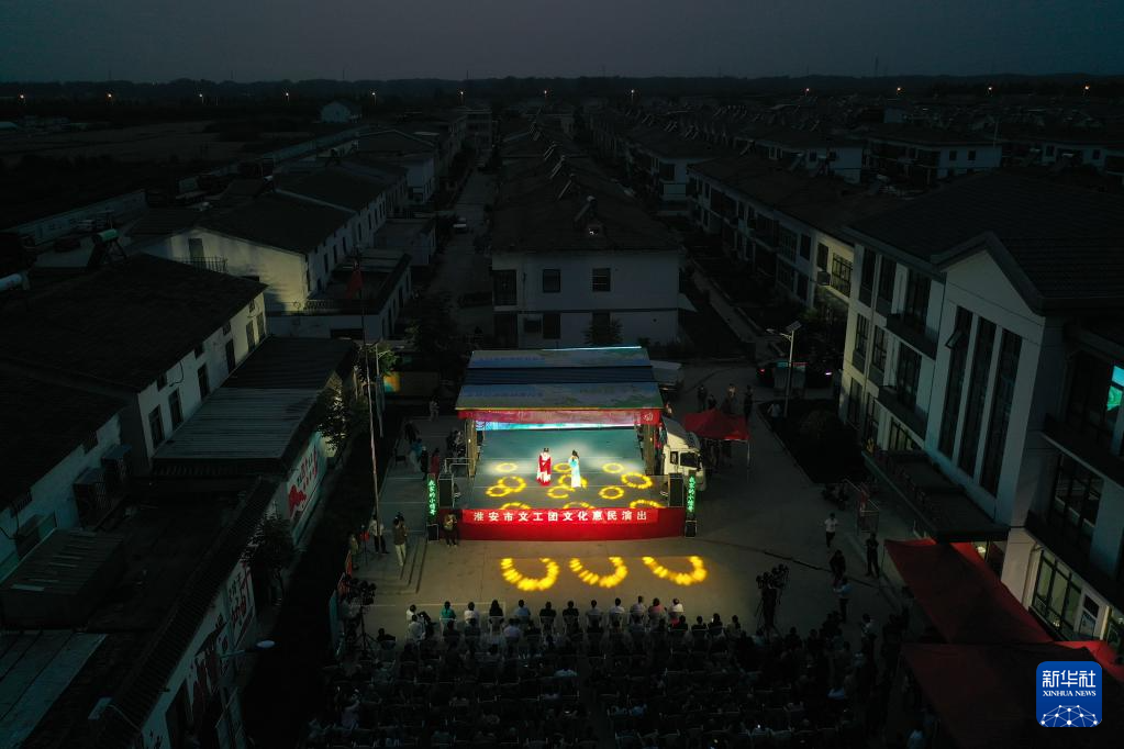 5月28日,江苏省文化和旅游厅送戏下乡活动在淮安市涟水县保滩街道肖渡村举行(无人机照片)。