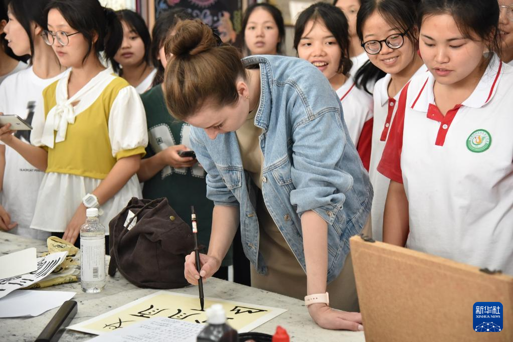 近日,“邂逅中国”来华留学生社会实践活动在贵州举行。6月5日,来自突尼斯、巴基斯坦、老挝、巴西、印度尼西亚等国家的20名来华留学生来到贵州省黔南布依族苗族自治州三都水族自治县的三都高级中学,和学生们一起参加该校举行的第一届国际文化节。
