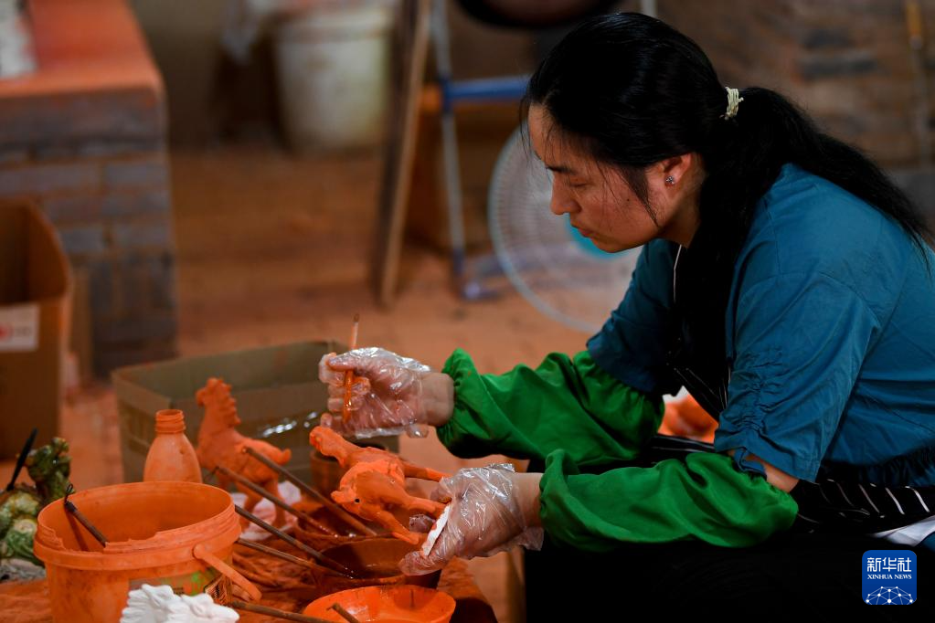 6月6日,工作人员在南石山村的唐三彩生产车间为唐三彩素胎施釉。