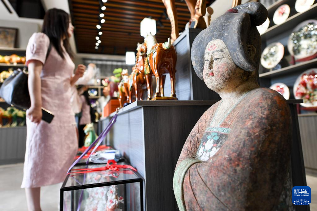 6月6日,游客在南石山村的唐三彩商铺内选购商品。