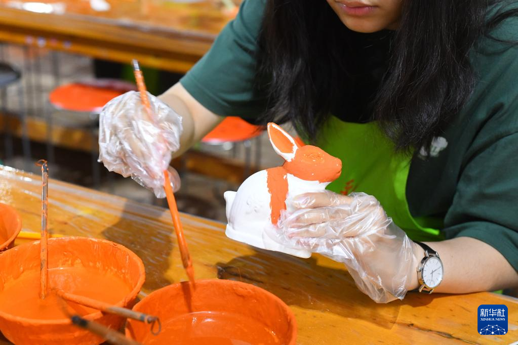 6月6日,一名体验者在唐三彩文化研学所为唐三彩素胎施釉。