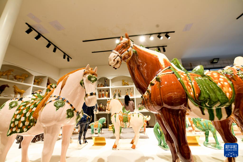 6月6日在南石山村拍摄的唐三彩作品陈列。