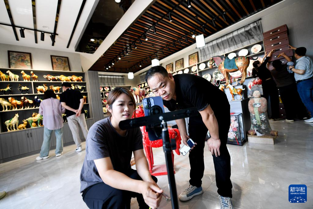 6月6日,工作人员在南石山村的唐三彩商铺内通过手机直播销售唐三彩。