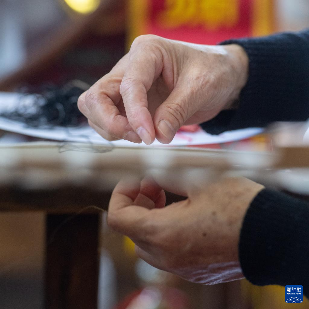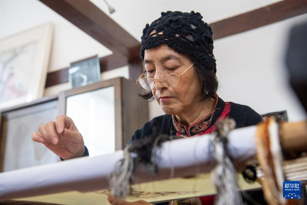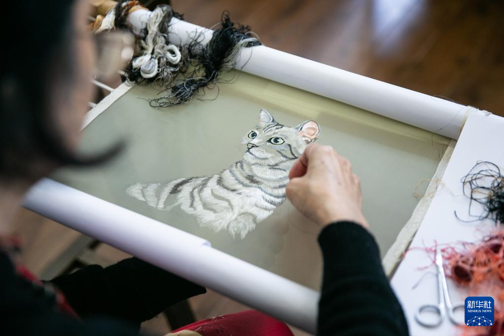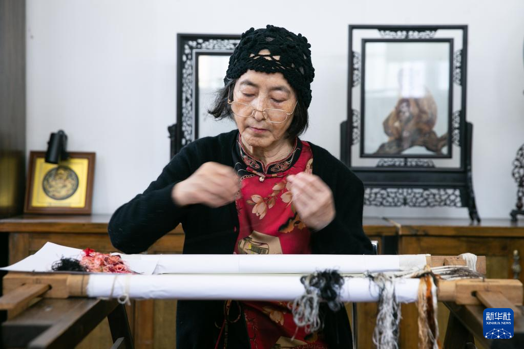 在重庆市渝中区的重庆渝康宁蜀绣艺术研究院,康宁在制作蜀绣作品(5月12日摄)。