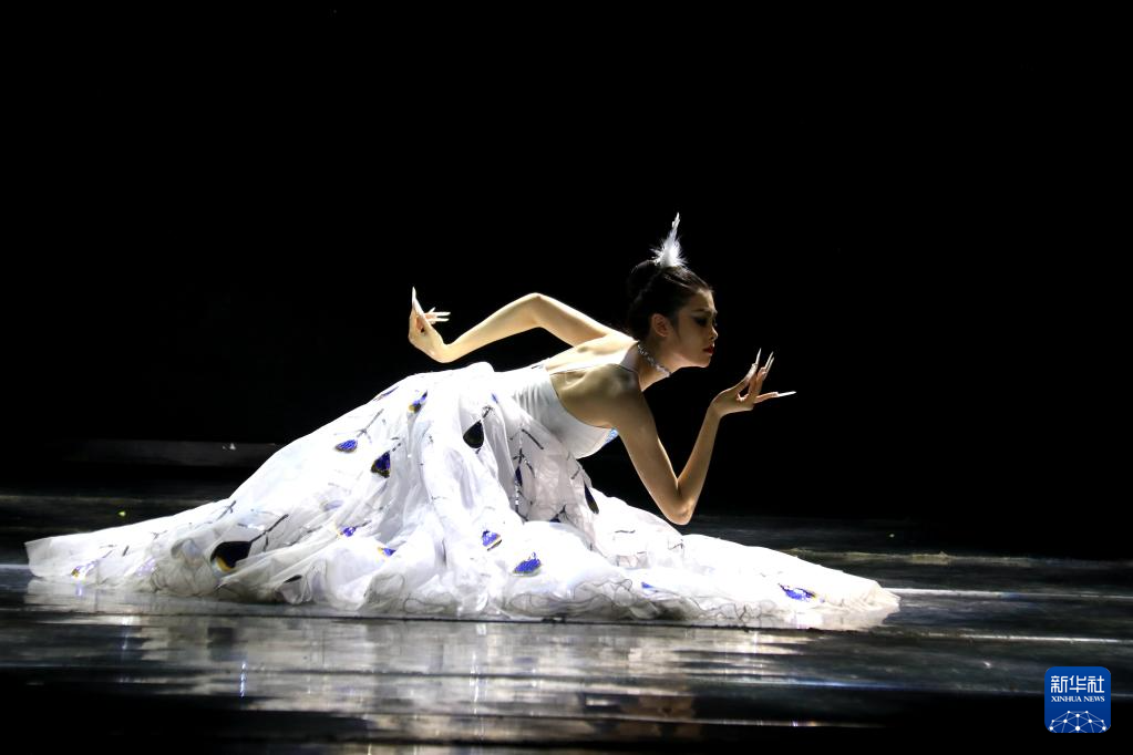 7月3日,在西北师范大学敦煌学院实验剧场,舞者为观众表演舞蹈《雀之灵》。