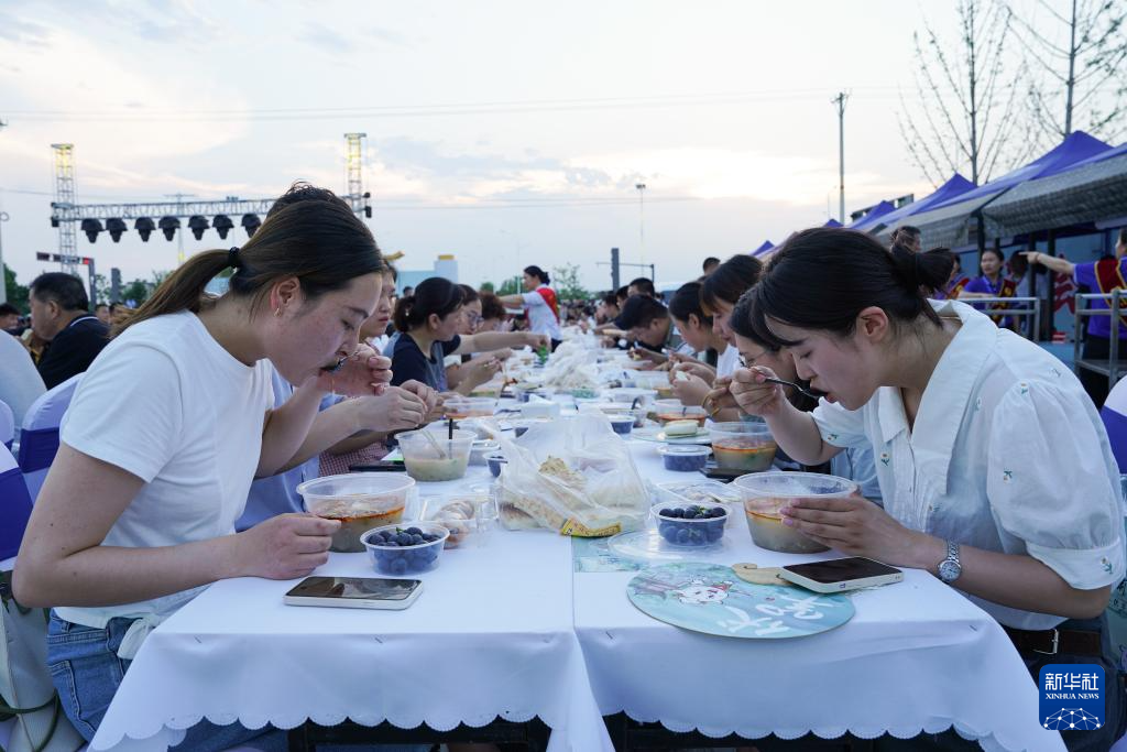 7月11日,在安徽省宿州市萧县水墨圣泉古镇广场,环卫工人品尝羊汤。
