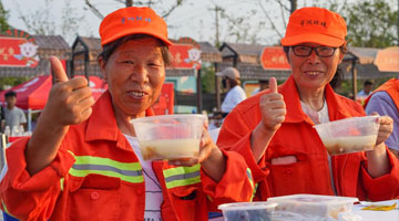 7月14日傍晚,游人在开封市开元广场设立的“非遗市集”现场品尝开封灌汤包。