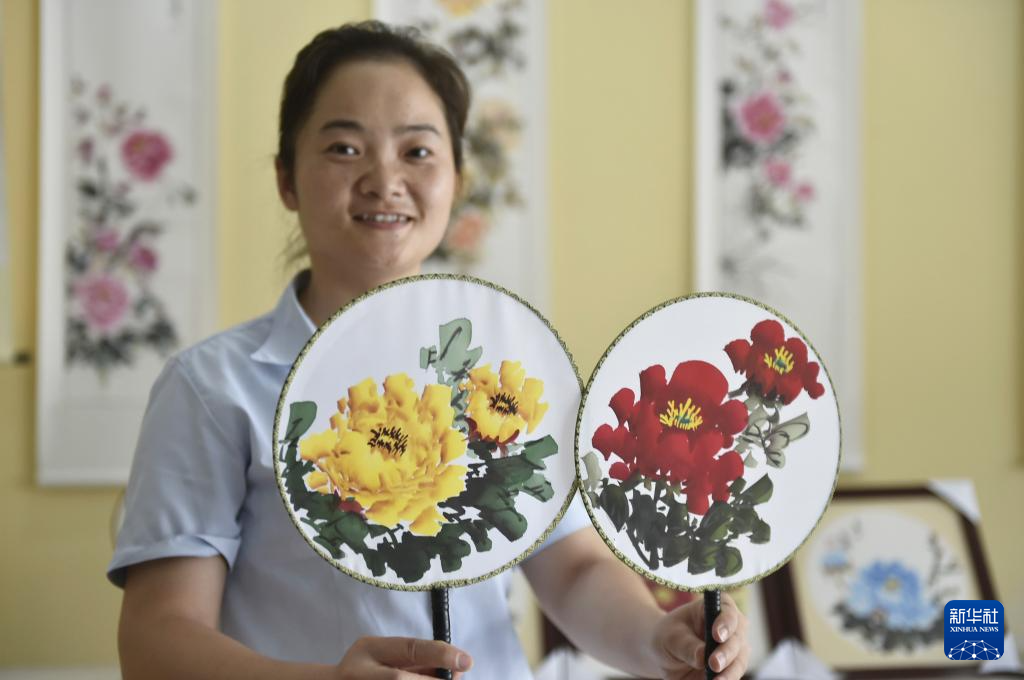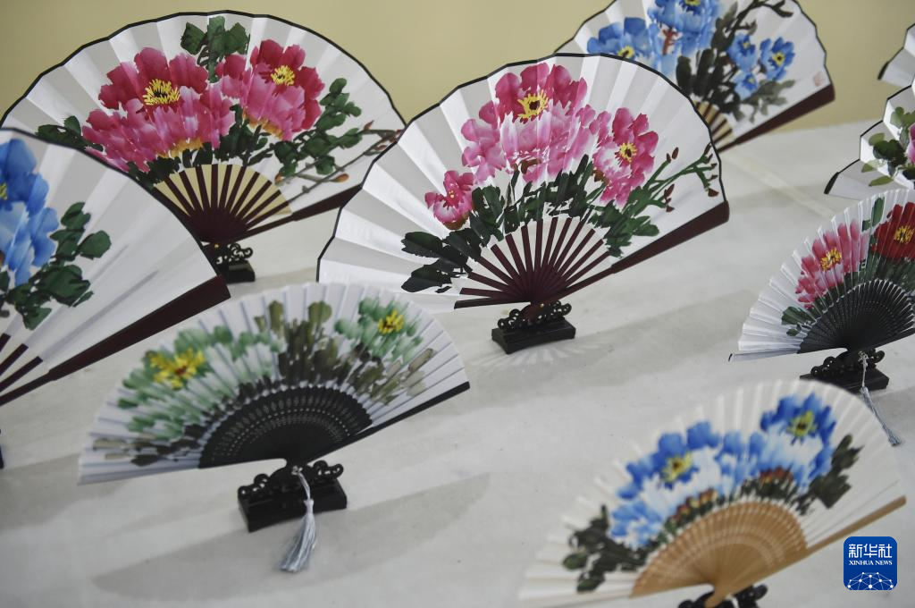 7月26日,工作人员在平乐社区的牡丹画创意产业园区展厅内展示牡丹画团扇。
