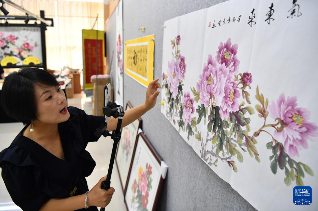 7月26日,工作人员在平乐社区的牡丹画创意产业园区内直播销售牡丹画。