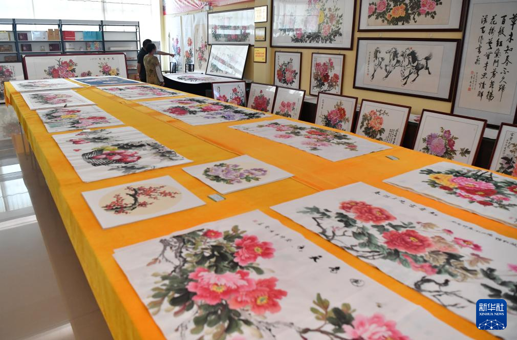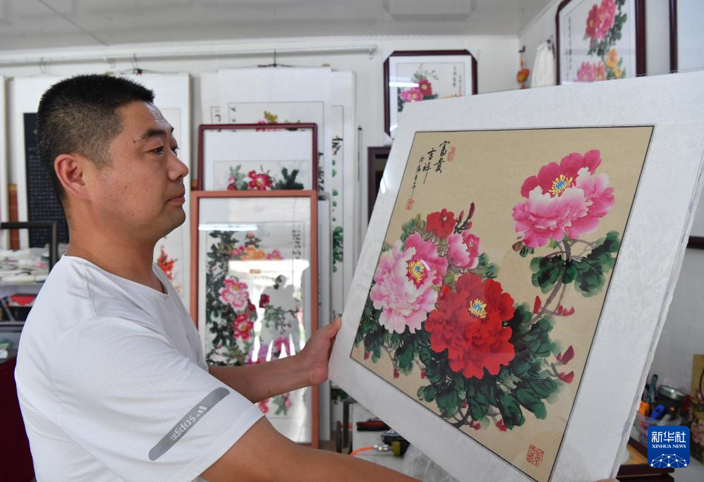 7月26日,工作人员在平乐社区的牡丹画创意产业园区内查看装裱后的牡丹画。
