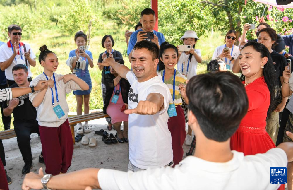 在乌鲁木齐晚报剧院,俄罗斯萨拉托夫州曙光歌舞团的演员邀请现场观众同台共舞(7月22日摄)。