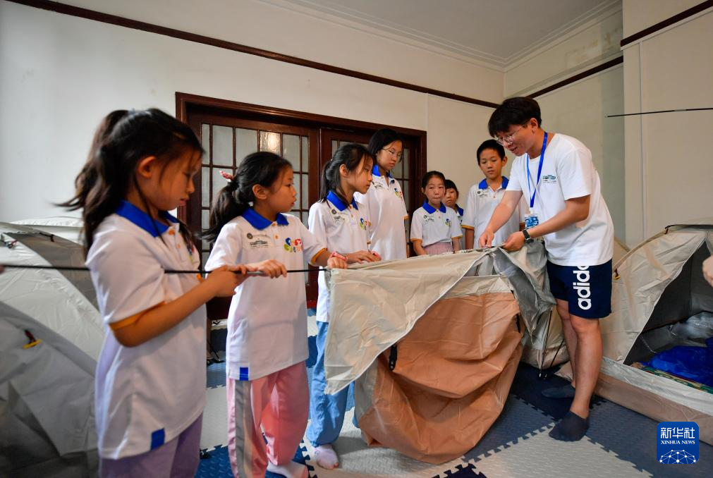 7月30日,在天津数字艺术博物馆,学生们在指导老师的帮助下学习搭建帐篷。