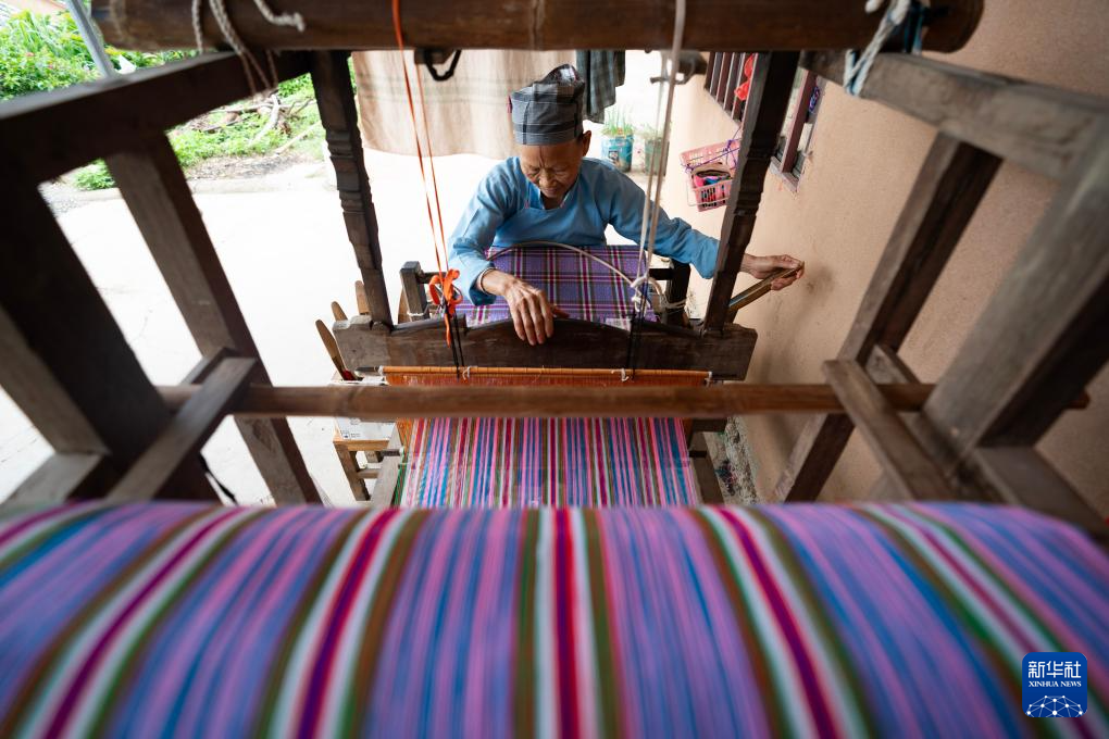 7月30日,一名坡芽村壮族村民在使用织布机织壮锦。