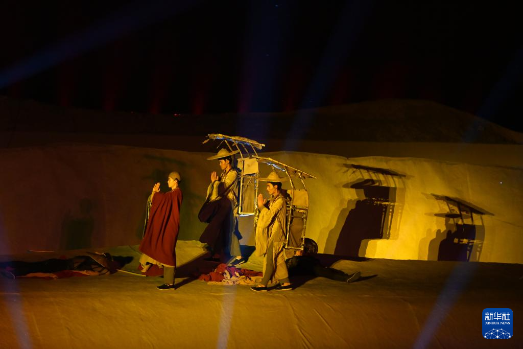 今年以来,脱胎于敦煌文化的洞窟沉浸式体验剧《乐动敦煌》、室内情景体验剧《又见敦煌》、沙漠实景演出《敦煌盛典》和中国残疾人艺术团情景音画剧《千手千眼》四场剧目在丝路名城甘肃敦煌同步上演,剧目将敦煌历史底蕴、服饰文化、乐舞文化等生动融合,为游客呈现出精彩绝伦的敦煌文化视觉盛宴,深受中外游客喜爱。截至8月10日,四大剧目今年已累计演出1175场次,观看游客突破66万人次。其中,《敦煌盛典》以敦煌鸣沙山月牙泉为背景,将沙漠景观与现代舞美结合,将墙体灯光融入实景演出,讲述了一段发生在古丝绸之路重镇敦煌的爱情故事,展示了敦煌的历史文化及人文风貌。