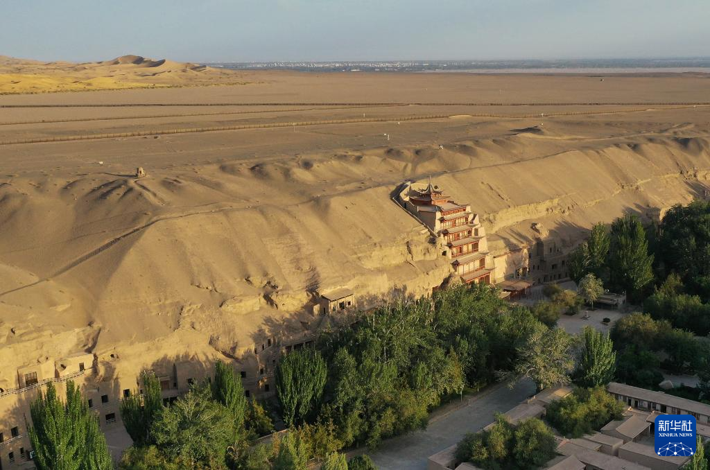 敦煌莫高窟崖体顶部戈壁带和沙地上采用草方格、灌木植物固沙等综合治沙措施保障石窟的防风固沙安全。监测结果表明,经过多年对流沙的持续治理,莫高窟受风沙影响情况得到了有效控制(8月4日摄,无人机照片)。