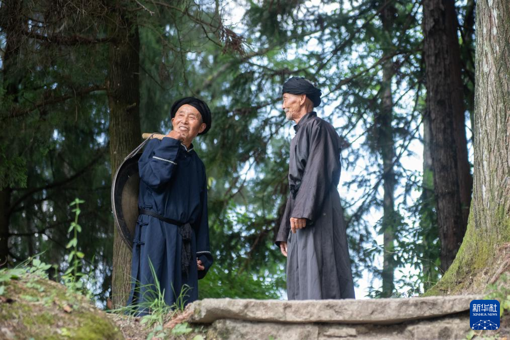 8月18日,舍米湖村村民彭大丙(右)和彭大照商量近期表演事宜。