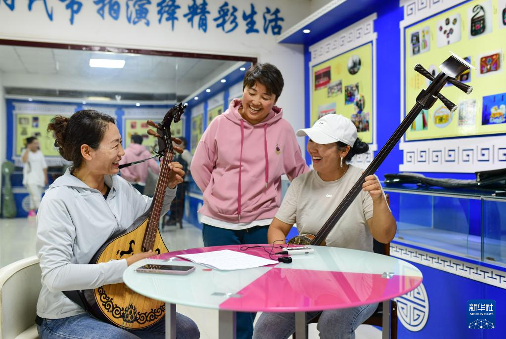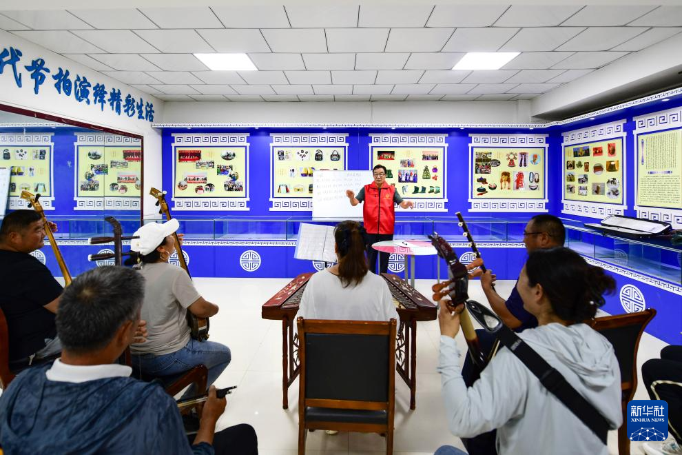8月26日,在鄂托克前旗上海庙镇阿勒台嘎查文化活动中心美育课堂上,农牧民交流乐器演奏技艺。