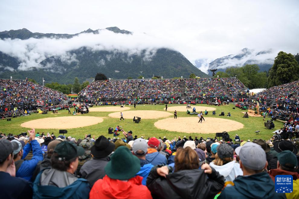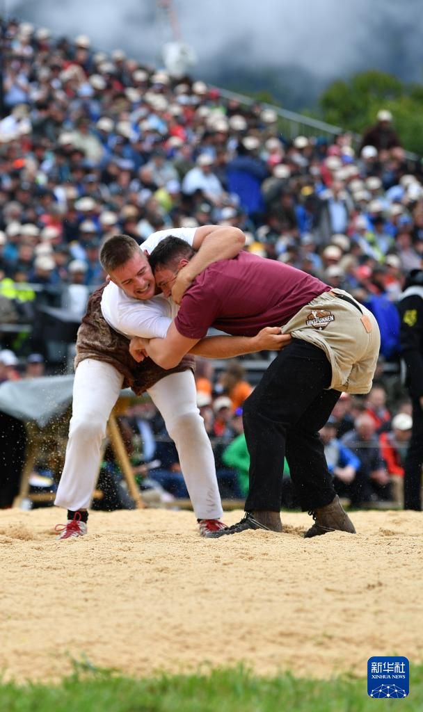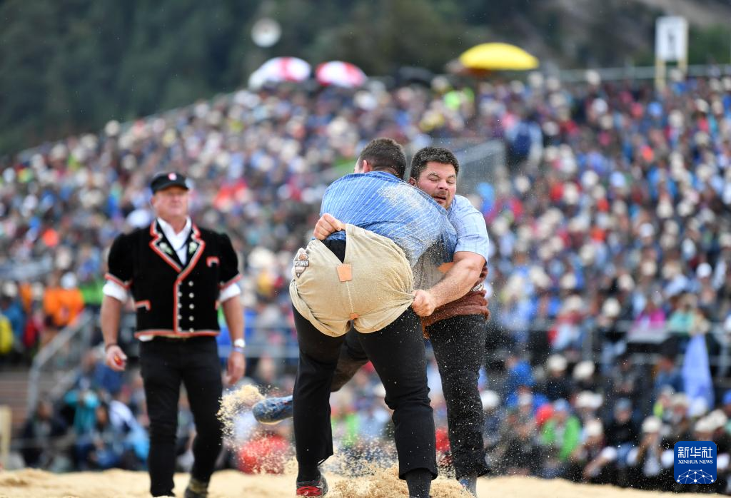 8月27日,在瑞士因特拉肯,人们在阿尔卑斯山牧羊人节上参加传统摔跤比赛。