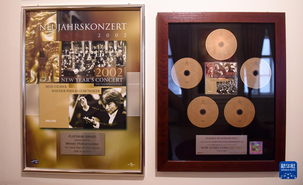 这是9月2日在奥地利维也纳“音乐之家”拍摄的2002年维也纳新年音乐会海报和唱片。