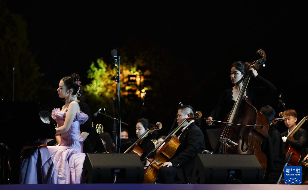 9月10日晚,钢琴家吉娜·爱丽丝(前左)与西安交响乐团在西安大雁塔北广场户外公演。
