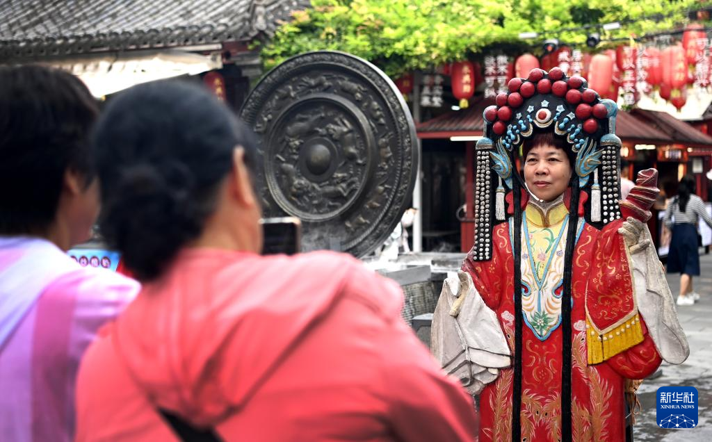 9月12日,西安市新城区“遇见城墙·非遗韵”非遗集市上,游客与秦腔戏服装置合影。