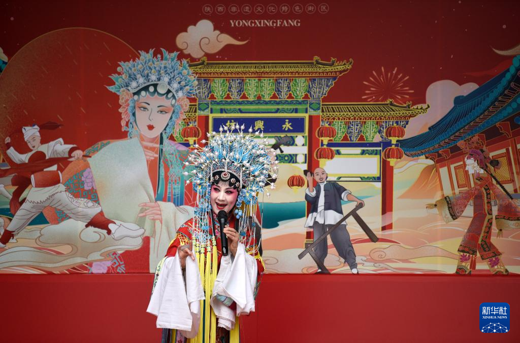 9月12日,西安市新城区“遇见城墙·非遗韵”非遗集市上,表演者在进行秦腔演出。