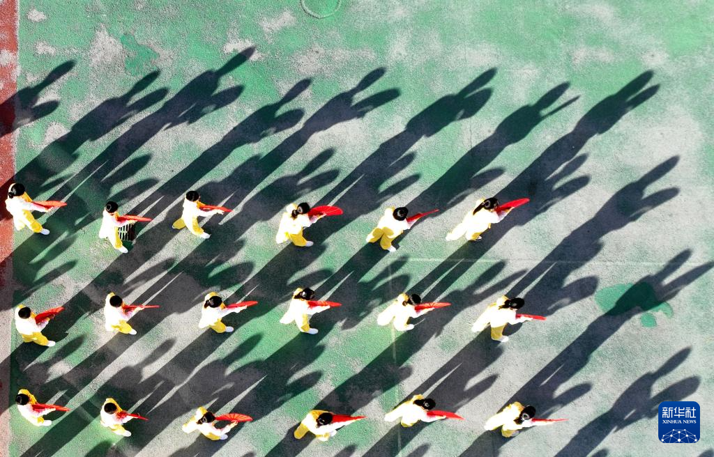 9月13日,在承德市双桥区会龙山小学,学生练习太极扇(无人机照片)。