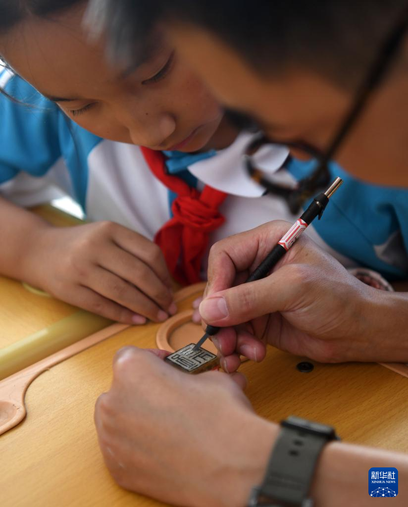 9月13日,在承德市双桥区会龙山小学,学生在老师的指导下练习篆刻。