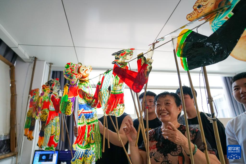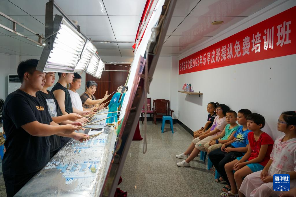9月13日,学生们在河北省乐亭县文化馆皮影教室内学习皮影表演技巧。