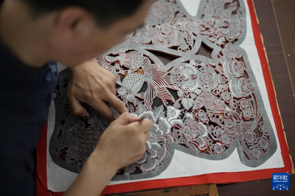 9月16日,剪纸艺人在玉田县“非遗会客厅”工作室内创作剪纸作品。