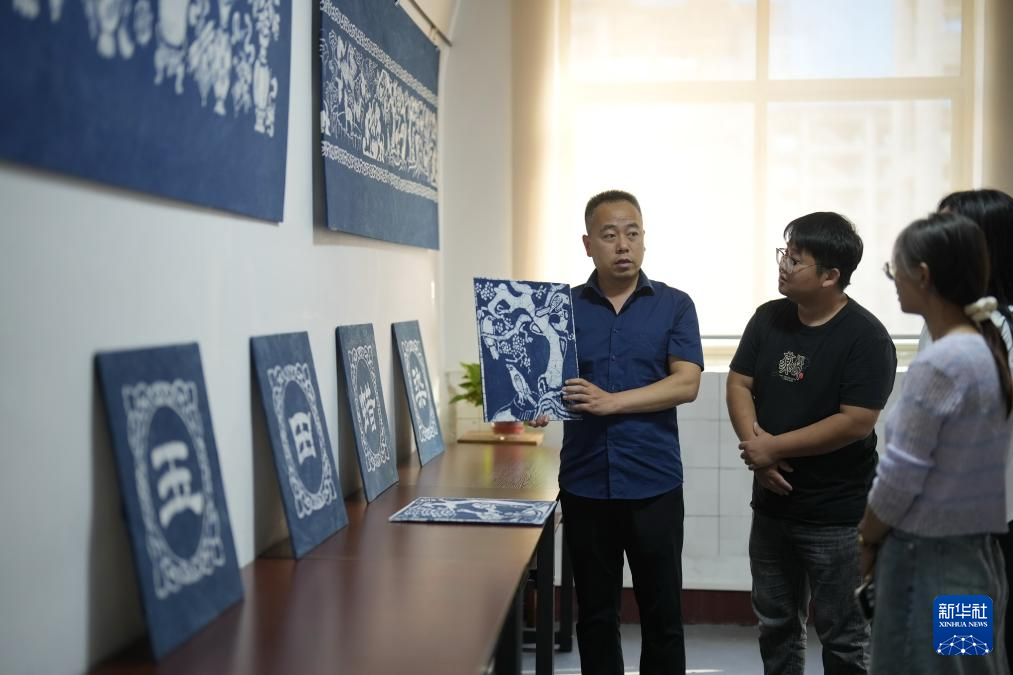 9月16日,玉田蜡染艺人在玉田县“非遗会客厅”工作室内向参观者介绍蜡染作品。