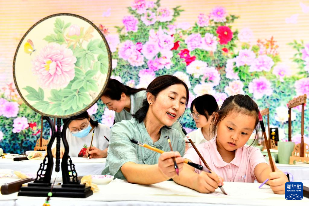 9月16日,在山东国际会展中心,来自巨野书画院的艺术工作者姚爱红教孩子给工笔牡丹画上色。