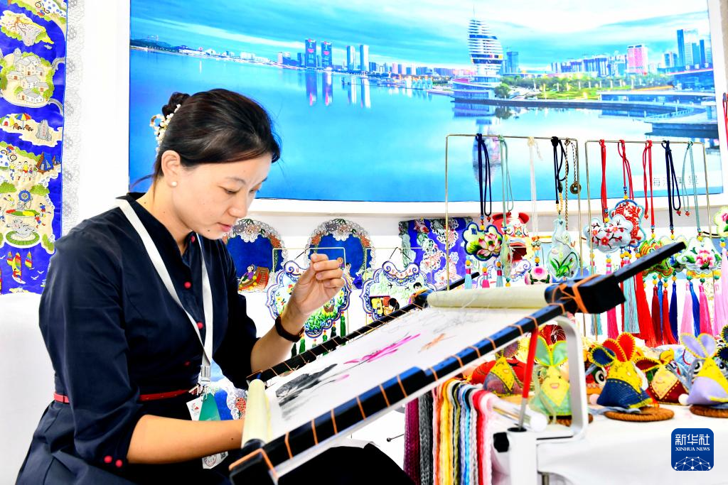 9月16日,在山东国际会展中心,日照市刺绣非遗传承人李兆梅现场展示刺绣技艺。