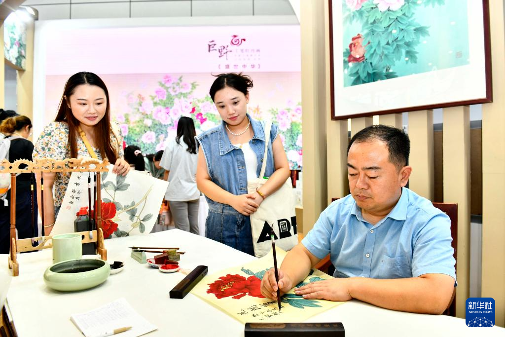 9月16日,在山东国际会展中心,来自巨野书画院的艺术工作者侯福常(右一)在展示工笔牡丹画技艺。