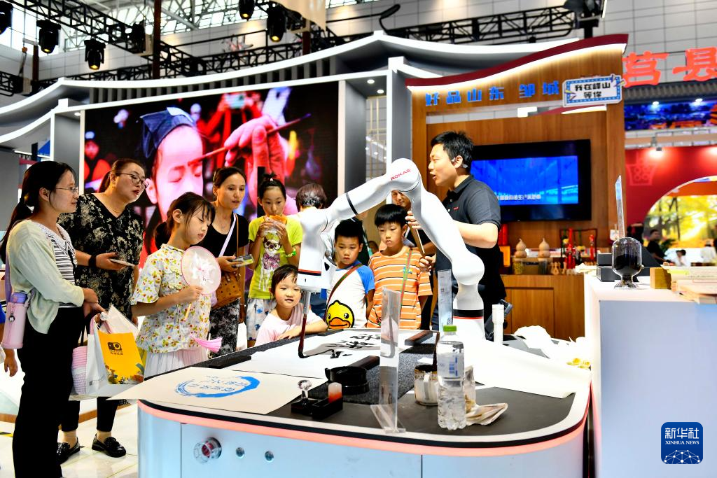 9月16日,在山东国际会展中心,来自济宁市的参会人员在展示机器人书写汉字。