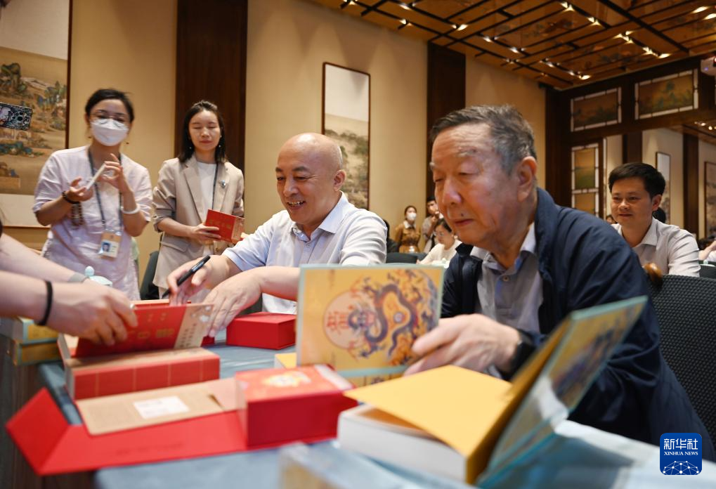 9月19日,故宫博物院院长王旭东(左三)、故宫博物院原院长郑欣淼(左四)在2024年《故宫日历》上签名。