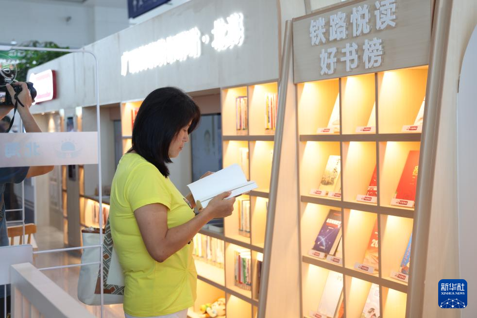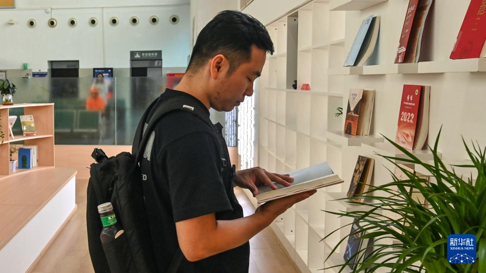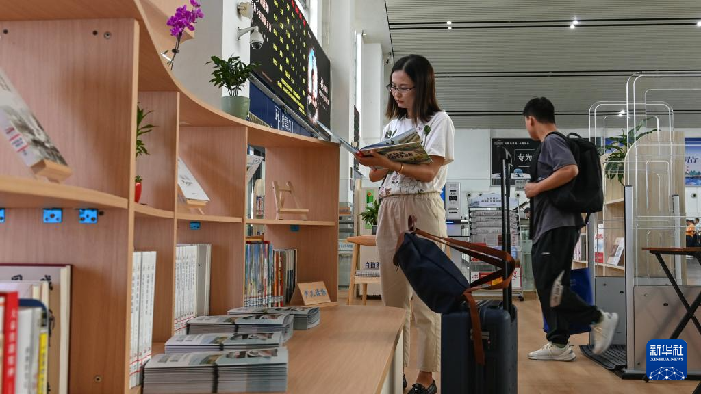 9月20日,在钦州东站,乘客在高铁读书驿站阅读书籍。