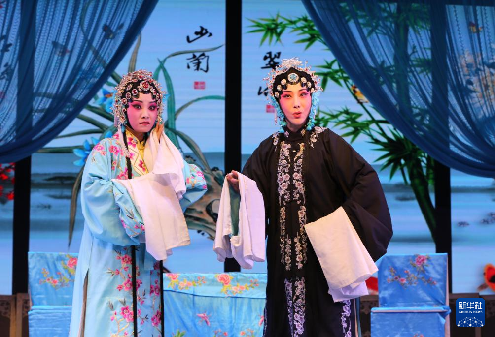 中国戏剧梅花奖得主、来自宁夏秦腔剧院的国家一级演员韦小兵(右)在甘肃省定西市体育公园演唱秦腔经典传统剧《下河东》(9月23日摄)。