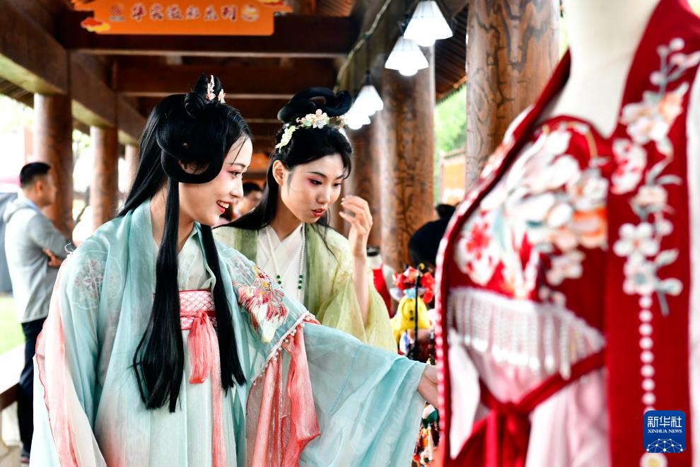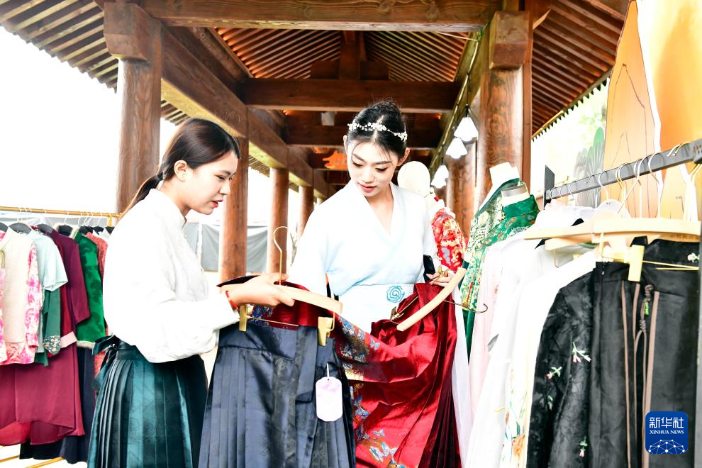 9月26日,在第九届尼山世界文明论坛“山东手造”精品展区,与会人员在挑选曹县汉服。