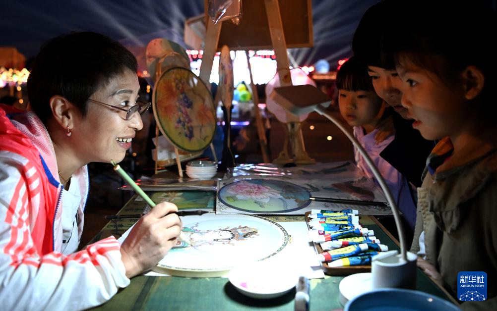 游客在大明宫国家遗址公园内了解绘画技艺(9月30日摄)。