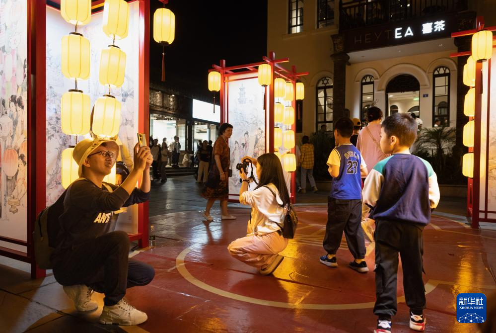 游客在成都宽窄巷子新“十二月市”街区留影(9月29日摄)。