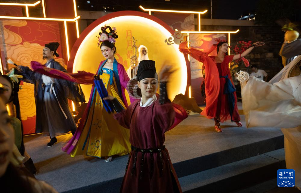在成都宽窄巷子新“十二月市”街区,装扮成唐宋时代人物形象的演员在巡游表演(9月29日摄)。