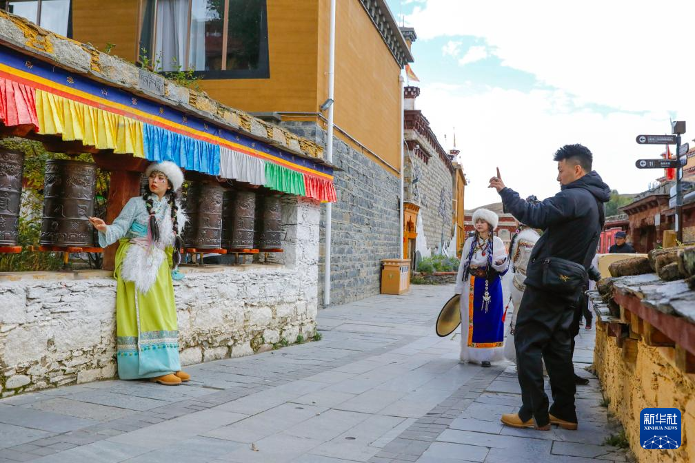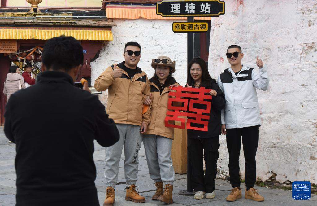 10月10日,游客在理塘县勒通古镇拍摄锅庄舞。