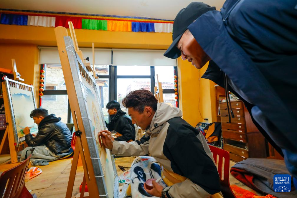 10月10日,游客(右)在理塘县勒通古镇的“唐卡馆”观看当地艺术家创作唐卡作品。